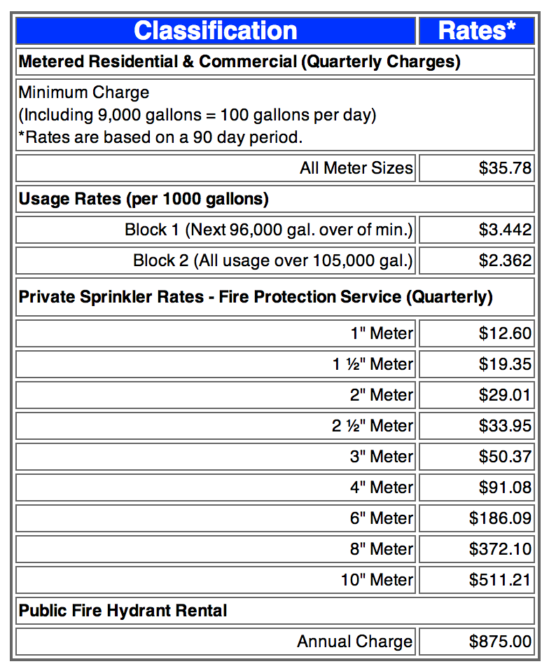 Average annual commercial charges, based on average usage of 466,000 gallons per year, will increase from $1,668.17 to $1,784.99. The annual rate charged per fire hydrant will increase from $875 to $936.