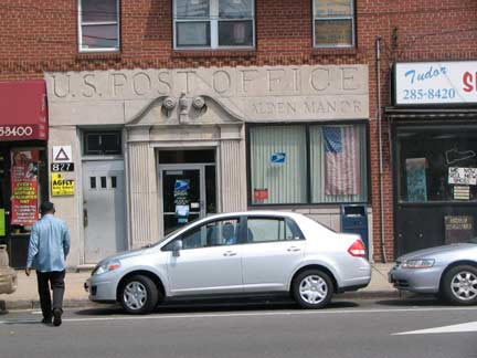 The brick office building, post office and residential building (dated 1941 or 1947) at Linden Blvd. and Elmont Road is unusual in a neighborhood full of frame buildings.