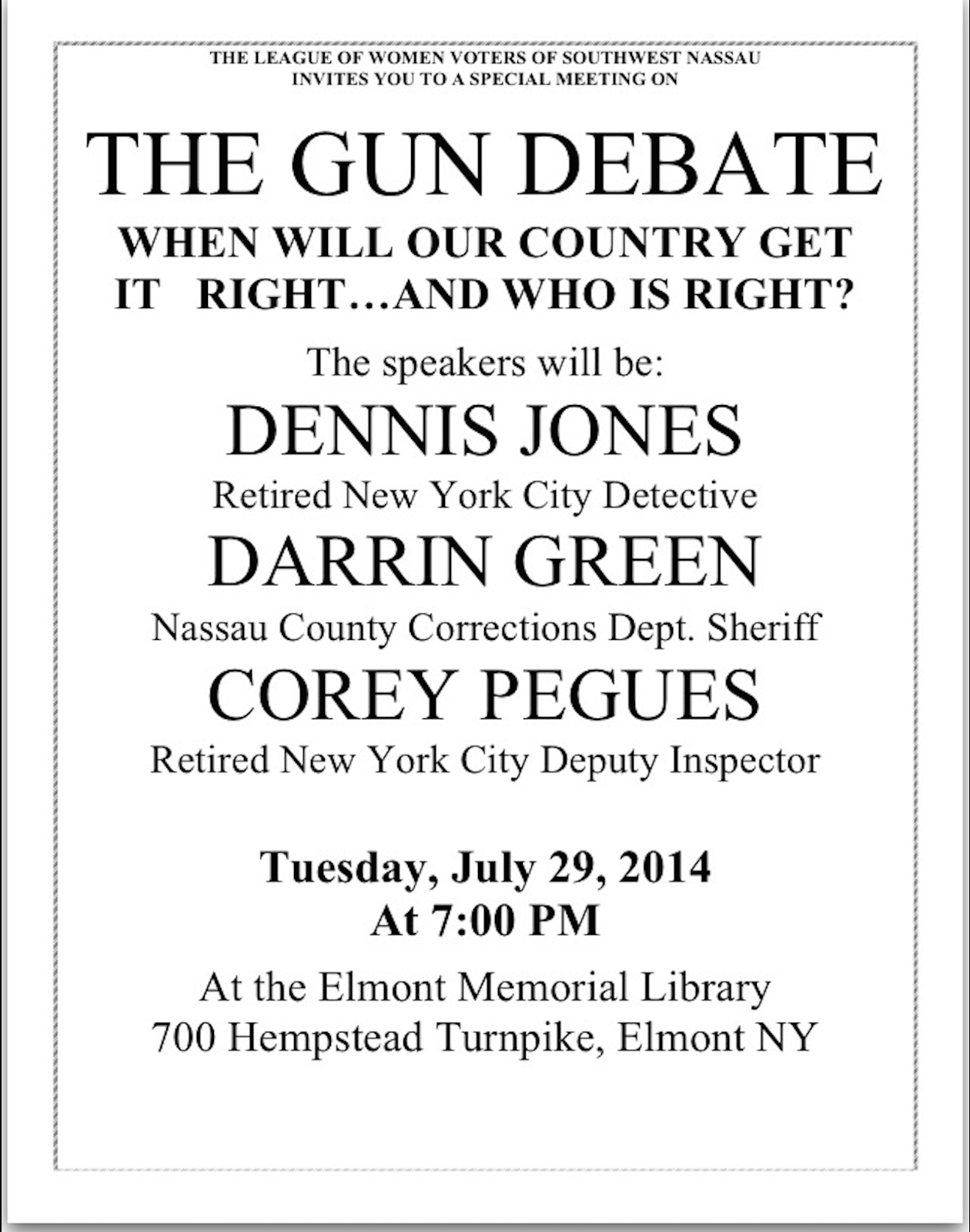 Elmont Library to Host Panel Discussion on Gun Control & Safety Posted byweareelmontJuly 29, 2014July 30, 2014Posted inUncategorizedTags:awareness, community, crime, debate, discussion, education, elmont, elmontlibrary, forum, gun, information, league, longisland, nassau, newyork, panel, police, safety, southwestern, violence, voters “The time is always right to do what is right.” – Rev. Dr. Martin Luther King, Jr. Let's excel, together:Tweet Click to email a link to a friend (Opens in new window) Email More Click to print (Opens in new window) Print Click to share on WhatsApp (Opens in new window) WhatsApp Share on TumblrLike Loading... Related