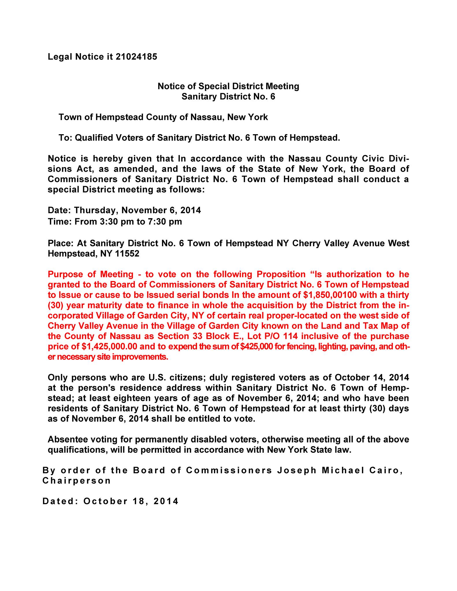 By law, Sanitation District 6 and Town of Hempstead are required to issue public notice which was made available in Newsday publications on Oct. 18th, 25th and once more before the vote.