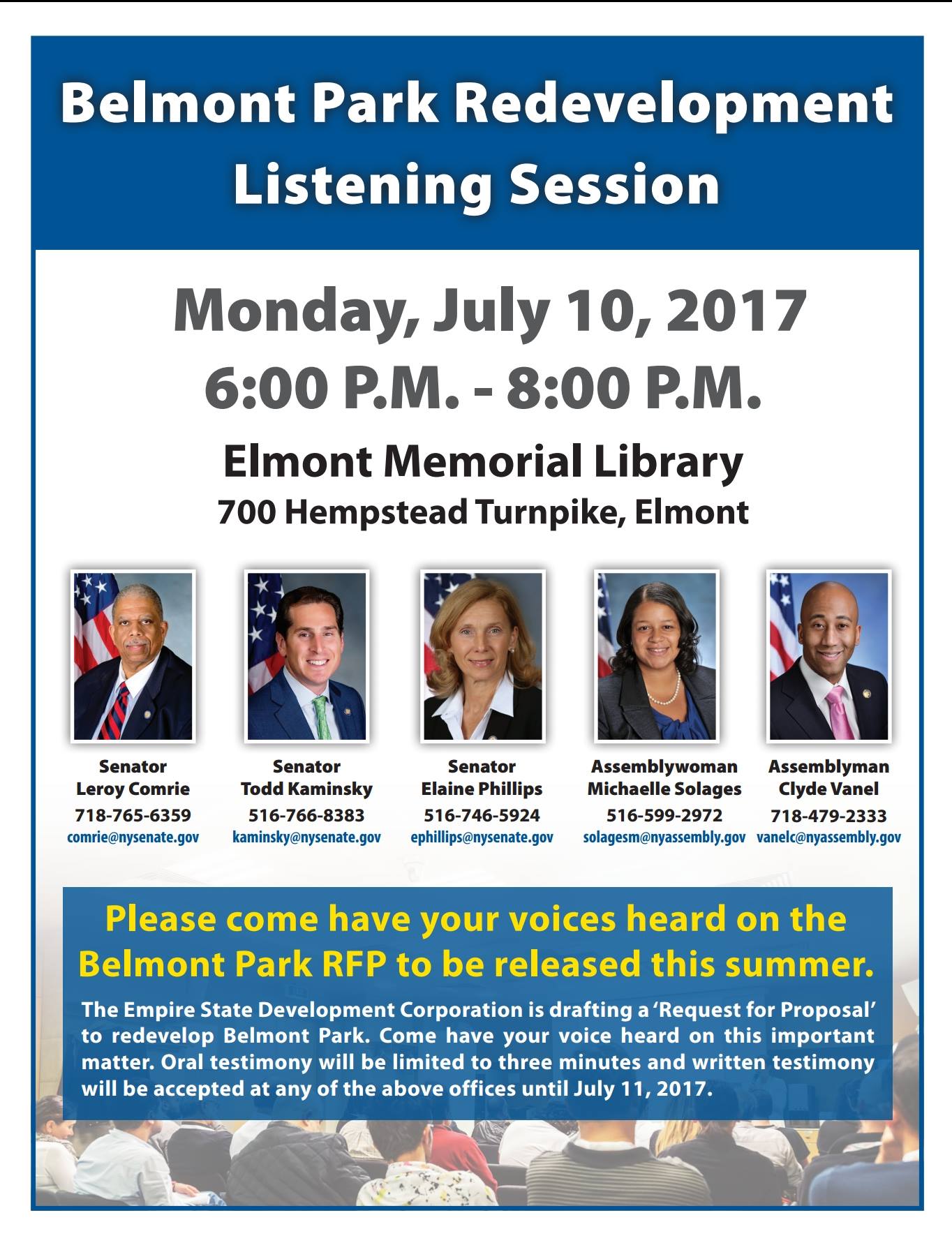 According to reports, Elmont may soon become home to the New York Islanders professional hockey team. Tonight, July 10th, 2017 at 6 p.m. inside Elmont Memorial Library, residents and community members will have a chance to give testimony about the proposed Belmont Park redevelopment. Because Elmont is a hamlet — not a town/village — the community relies heavily onContinueContinue reading “TONIGHT: Elmont Residents Unite for Public Meeting To Determine the Community’s Future”